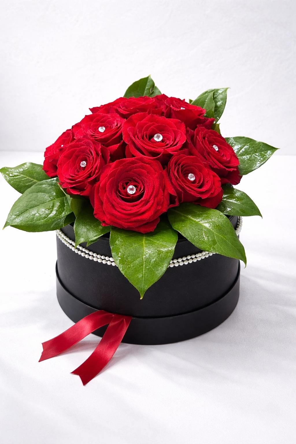 Arreglo de rosas rojas en caja elegante, con detalles tipo diamante y follaje verde. Presentación moderna con un acabado limpio y llamativo.