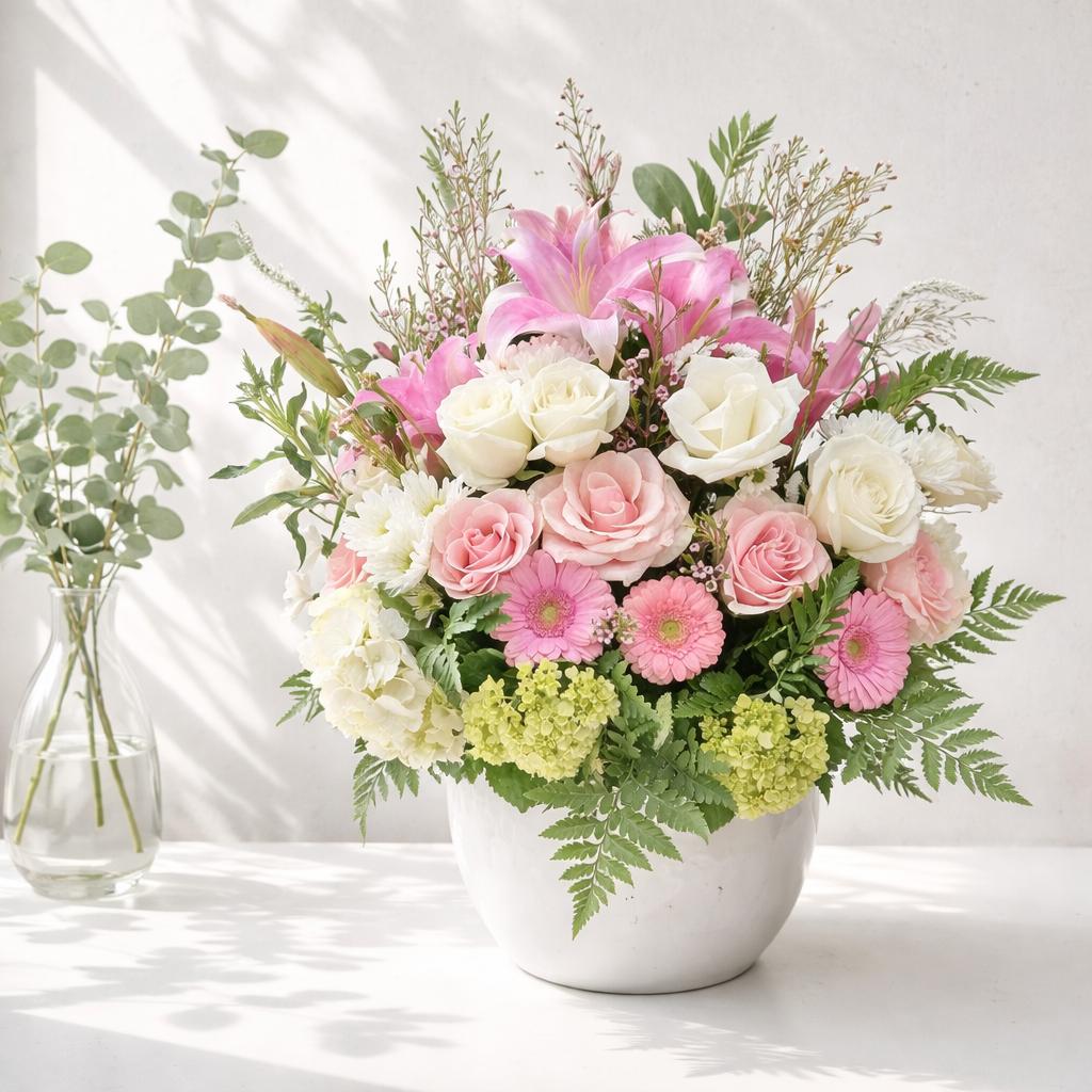 Un arreglo floral elegante que combina rosas en tonos rosados y blancos con lirios rosados y flores complementarias que aportan textura y contraste. El follaje verde enmarca la composición, creando un diseño armonioso, fresco y lleno de delicadeza.