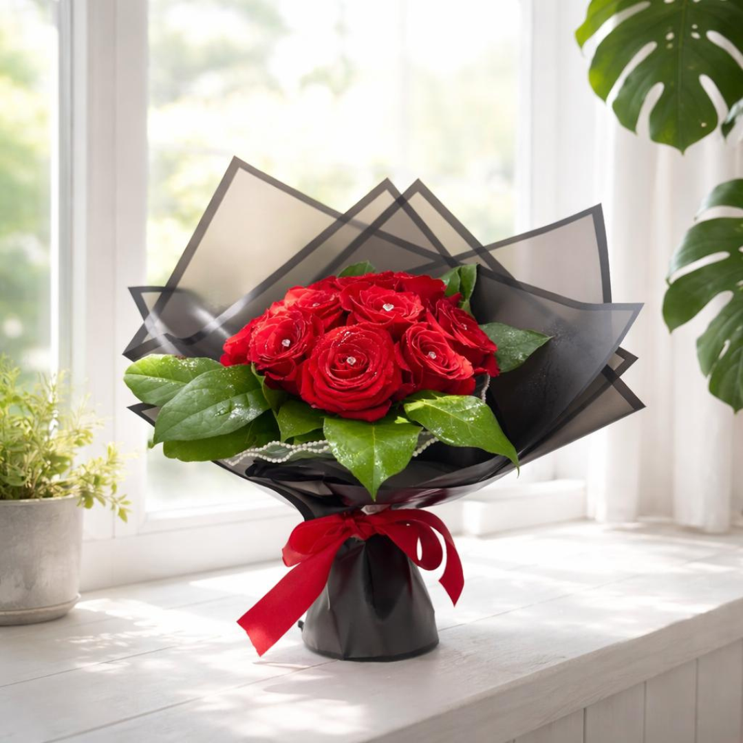 Arreglo de rosas rojas con follaje verde, envuelto en un elegante papel negro. Destaca por su contraste y presentación limpia.